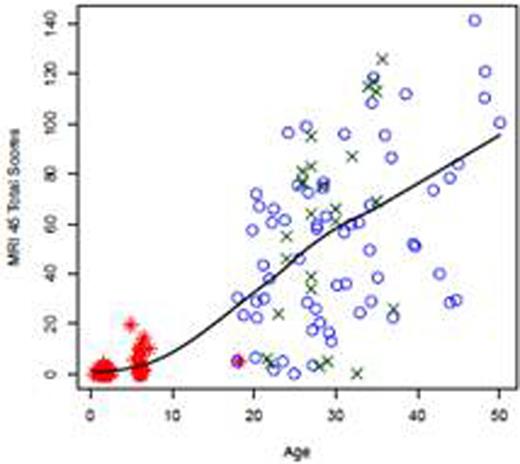 Data from individual participants in 3 studies who received on demand therapy were aggregated into a single database. Eligibility for this analysis included FVIII ≤ 2%, negative history for inhibitor, bleeding history for 12 months prior to study data acquisition and assessment of both ankles, knees and elbows; joints were assessed using physical examination (PE) and T2* gradient echo MRI scored as previously described using the World Federation of Hemophilia Gilbert score and the 45 point extended MRI scales [Haemophilia;6:649; ISTH OP Mon 7/1/13, 9 am]. MRI data were divided into soft tissue and osteochondral changes. Bleeding and Gilbert data for all 6 joints and MRI data for knees and ankles were analyzed using standard descriptive statistics and regression methods to quantify the rate of change in scores of joint damage with age.