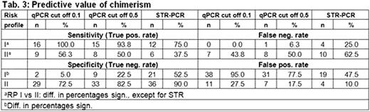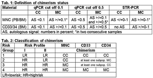 Monitoring of 75 transplantations, performed in 72 patients at 11 German pediatric transplant centers between 05/2005 and 04/2009, included 26 (0-84) PB and 5 (0-21) BM samples per patient and covered 1.5 (0.1-4.3) years (median). PB was analyzed weekly and BM at days 30, 60, 100 and 6, 9, 12, 15 and 18 months post-transplant. Lowering the quantifiable limit by qPCR (here </=10E-3 (0.1%)) can result in detection of recipient derived (autologous) signals (AS) in virtually every sample. The challenge was to define a clinically relevant cut off level for diagnosis of complete (CC) or mixed chimera (MC). For qPCR, cut off levels of 0.1 and 0.5% for AS were evaluated and chimerism was defined according to tab. 1. Based on this definition, risk groups and profiles were specified (tab. 2). Allocation into risk groups 2 to 4 was done at day of first MC in either compartment. Risk profile I (RP I) defined each sample with MC in either compartment as HR, whereas risk profile II (RP II) defined each sample with MC in MNC as HR.