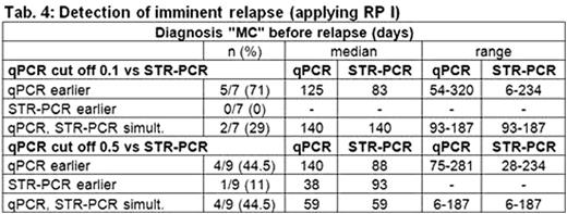 56/75 transplant follow-ups allowed for analysis of predictive value of chimerism (tab. 3). Sensitivity of RP I ranged from 100% (qPCR cut off 0.1) to 75% (STR-PCR); notably specificity was low and false pos. rate high, if this highly sensitive approach was applied. In RP II sensitivity was significantly lower compared to RP I, but specificity was considerably higher and false pos. rate lower. Relapse was predicted earlier by qPCR with a median of 42 days compared to STR-PCR in 71% if 0.1% cut off for definition of MC was applied (tab. 4). If 0.5% cut off was used, this rate dropped to 44.5%.