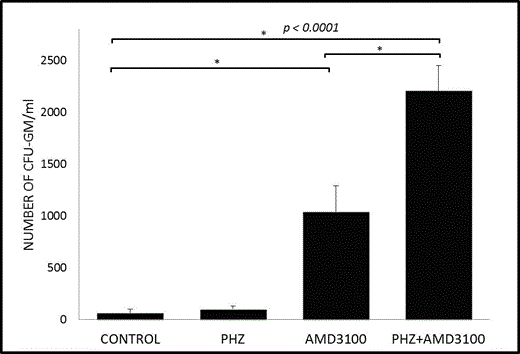 Since erythrocytes are a major source of plasma S1P, we asked whether massive hemolysis of erythrocytes leading to an additional increase in plasma S1P level would trigger mobilization of HSPCs. Furthermore, to shed more mechanistic light on the mobilization of HSPCs in PNH patients and to distinguish the effect of an increase in the S1P chemotactic gradient in PB plasma from the effect of defective retention of HSPCs in the BM microenvironment, we performed mobilization studies in mice exposed to the hemolysis-inducing agent phenhlhydrazine (PHZ) ± blockade of the BM-retaining SDF-1–CXCR4 axis by AMD3100.