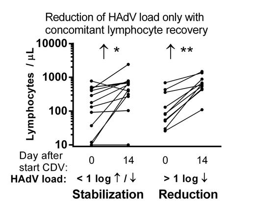 Response was evaluated after 14 days of CDV therapy. A ≥ 10x (1 log) reduction of HAdV load was measured in 10 of 27 evaluable patients (37%) while 13 patients (48%) showed a stabilization of HAdV load. CDV treatment failed in 4 patients (15 %), as define by a 1 log increase of HAdV load despite uninterrupted CDV therapy. In 23 patients with a reduction or stabilization of the HAdV load, lymphocyte numbers increased strongly in the two weeks after initiation of CDV treatment (median 130 to 608 lymphocytes / µL, p < 0.0001, Wilcoxon signed-rank test). This increase was caused by reconstitution of NK cells (n = 5), T-cells (n = 4) or both (n = 12). In only 2 patients with a stabilization of HAdV load, no concomitant reconstitution of NK or T-cells was observed.