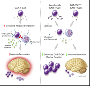 Illustration based on brain magnetic resonance imaging (MRI) of an acute lymphoblastic leukemia patient–derived xenograft treated with CD19-directed chimeric antigen receptor T-cell (CART19) therapy and granulocyte-macrophage colony-stimulating factor (GM-CSF)–neutralizing antibodies. GM-CSF depletion during CART19 therapy results in reduced neuroinflammation. See the article by Sterner et al on page 697.
