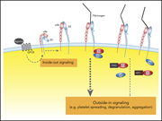 Platelet binding to β-integrins is associated with bidirectional signaling. Inside-out signaling upon platelet activation facilitates platelet adhesion and aggregation; outside-in signaling amplifies platelet activation and thrombus extension. The authors demonstrated that modifying adaptor molecule binding to β-integrins can selectively inhibit thrombus extension without threatening primary hemostasis.