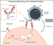 Antibodies targeting chemoresistant cells can successfully treat lymphoid malignancy. However, targeting surface antigens in acute myeloid leukemia (AML) is difficult, since most antigens are also expressed on normal stem cells. Augsberger et al describe a novel bispecific antibody targeting CDɛ and Wilms’ tumor 1 (WT1), an intracellular protein that is expressed in <1% of bone marrow cells. Using a bivalent T-cell receptor–like binding domain that recognizes processed surface WT1 antigen in the context of (HLA) A*02, this molecule kills AML cell lines and primary cells ex vivo and in vivo.