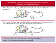 Immune thrombotic thrombocytopenic purpura (iTTP) is mediated by severe ADAMTS13 deficiency due to autoantibodies that increase clearance and reduce function, leading to unusually large and extremely adhesive von Willebrand factor (VWF) multimers and platelet clumping in the microcirculation. Halkidis et al reexamine the mechanism of ADAMTS13 inhibition by 3 pathogenic antibodies using enzyme kinetic assays. The authors’ data support a novel model whereby iTTP antibodies induce an allosteric inhibition of the metalloprotease domain, rather than by influencing binding of VWF to ADAMTS13.