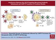 CD19-targeted chimeric antigen receptor T-cell (CART19) therapy requires tumor cell CD19 expression, and it is unclear whether prior anti-CD19 antibody therapy impairs response to CART19 therapy. Sakemura et al studied the impact of tafasitamab exposure on subsequent CART19 therapy in preclinical models. Concomitant treatment leads to competition for binding and impairs response to CART19; however, pretreatment with CD19 antibody does not impair CART19 responses. This pretreatment reduced cytokine release syndrome and showed superior antitumor effect and overall survival in mice, suggesting clinical development of the combination may lead to better outcomes.