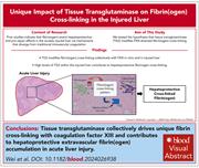 Fibrinogen has hepatoprotective and prorepair effects in the acutely injured liver. Wei et al investigated the roles of factor XIII (FXIII) and tissue transglutaminase (TG2), capable of introducing cross-links into substrates that involve distinct glutamine and lysine side chains. The authors show that TG2 drove unique in vitro fibrin cross-linking with thrombin-activated FXIII, thus providing hepatoprotective effects in acute liver injury.