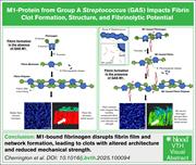 Laser scanning confocal microscopy of fibrin clots with recombinant M1 protein (0-60 μg/mL). Fibrinogen (Alexa Fluor 594) in human plasma was clotted, imaged as 20-μm Z-stacks (58 slices), and reconstructed in Imaris to generate 3-dimensional isosurfaces. The color scale reflects fibrin intensity. Scale bar, 20 μm. In plasma-only controls, a continuous fibrin film (arrow) overlays a distinct fibrin fiber network. With increasing M1, the film becomes progressively porous and lower intensity; at 60 μg/mL, it is absent or indistinguishable from the underlying network. See the article by Cherrington et al.