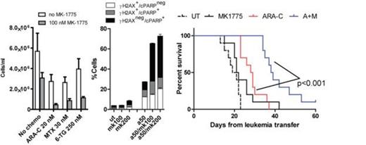 We have found that MK1775 synergistically inhibits proliferation of the T-ALL Jurkat cell line with several antimetabolite chemotherapeutics including cytarabine, 6-thioguanine, and methotrexate. In contrast, MK1775 does not sensitize Jurkats to doxorubicin or etoposide, suggesting specific sensitization to antimetabolites. The addition of MK1775 enhances the antimetabolite induced apoptosis, as measured by Annexin V/7-AAD staining, and PARP cleavage measured by Western blotting. As expected, the addition of MK1775 enhances DNA damage induced by cytarabine as measured by γH2AX staining and flow cytometry, although preliminary data suggest that this is not the only mechanism of enhanced cell death, as a substantial proportion of cleaved PARP+ cells does not stain for γH2AX. In addition, we have found that AML cell lines with both wild-type and mutated TP53 are sensitive to chemosensitization by Wee1 inhibition. Furthermore, in isogenic models of p53 dysfunction, we have found that the functionality of p53 does not influence chemosensitization. Lastly, in an aggressive mouse model of AML, we observed enhanced disease control and survival in mice treated with MK1775 and ARA-C as compared to ARA-C alone. Hematotoxicity associated with treatment was related to the duration of combination therapy, but was tolerated well with intermittent dosing.