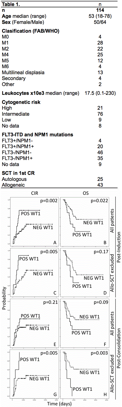 This retrospective and multicentric study included 114 patients with WT1-overexpressed AML (Table 1). Quantitative assessment of WT1 transcript levels was performed by quantitative RT-PCR in 283 bone marrow (BM) samples at diagnosis, post-induction and post-consolidation. WT1 gene expression was calculated by relative quantification using the normalized ratio of the target gene (WT1) related to a reference gene (GUS) and using cell line K562 as calibrator. Inter-laboratories methodological standardization was accomplished through a pilot study with 10 BM donor samples, 20 BM patient samples and commercial WT1 plasmids (ProfileQuant Kit, Ipsogen-Qiagen).