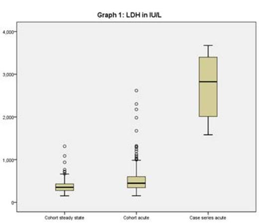 On a retrospective review of our medical records (2006-2013), we identified 12 admissions in 12 different patients with both strikingly elevated LDH (> 1500IU/L) AND thrombocytopenia (platelets <150 x109/L). Laboratory values for the King's cohort in steady state, in acute admissions and for the case series are in graphs 1 (LDH) and 2 (platelets).