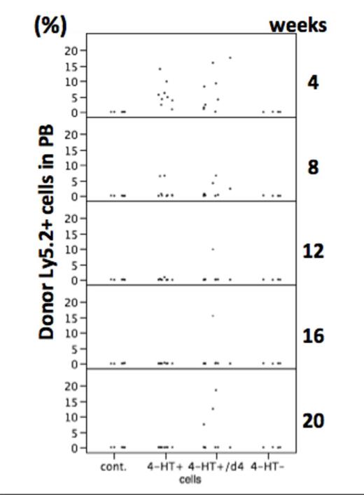 GATA2 is a key transcription factor for hematopoiesis and expressed abundantly in HS/PCs. GFP-positive BM cells were prepared from C57/BL6 (Ly5.2) mice which have GFP cDNA inserted into exon 2 of the GATA2 gene, and were reprogrammed to pluripotency (GG-iPSCs) according to the standard method. HOXB4-ER cDNA encoding HoxB4-ligand binding domain of estrogen receptor chimeric protein was constructed and used to transduce GG-iPSCs (GGH-iPSCs). Transcriptional activity of HoxB4 is 4-HT-dependent in this context. Then, GGH-iPSCs were subjected to 3 different culture conditions during hematopoietic induction over an OP9 monolayer as follows. HoxB4+ and HoxB4- indicate cultures continuously supplemented with or without 4-HT throughout 2 months, respectively, and HoxB4+/d4 denotes 2 months of HoxB4+ culture followed by 4 day's depletion of 4-HT. Resulting non-adherent cells were analyzed by FACS and RT-PCR. Furthermore, to examine in vivo repopulating ability of those, HoxB4+ (n=12), HoxB4- (n=8) or HoxB4+/d4 (n=9) -derived cells were transplanted into sublethally irradiated Ly5.1 congenic mice. Control mice (n=5) were irradiated only. The ratio of peripheral blood donor cells was monitored every 4 weeks, and at 20 weeks after transplantation, lineage marker-negative (Lin-) cells from recipient BM were analyzed.