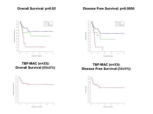 the median number of CD34+ and CD3+ cells infused was 2 (0.6-11)x106/Kg and 3 (0.9-17)x107/Kg, respectively. Two patients died early. All 55 evaluable patients engrafted at a median of 20 days (range,12-29) and the cumulative incidence (CI) of neutrophil engraftment was 96.5±0.1% at 30 days. The 100-day CI of II-IV and III-IV grade acute GVHD was 33±0.4% and 11±0.2%, respectively. Extensive chronic GVHD occurred in 6 out of 51 (12%) evaluable patients and the 2-year CI of extensive chronic GVHD was 18±0.4%. The 6-mos and 1-year CI of transplant-related mortality (TRM) was 24±0.4% and 26±0.4%, respectively. The overall CI of relapse was 20±0.4% at 1-year and 38±0.8% at 5-year. With a median follow-up of 30 mos (range, 4-67), the 5-year probability of overall (OS) and disease-free survival (DFS) was respectively 52±7% and 43±7% for all patients, 65±9% and 58±9% for patients in CR1, 49±15% and 38±16% for patients in CR2, 12±11% and 0.0% (at 3yrs) for patients transplanted in advanced phase. For 33 patients transplanted in early (CR1+CR2) disease stage and conditioned with the TBF-MAC regimen, the 5-year probability of OS and DFS was 69±8% and 58±9%, respectively, while OS and DFS at 3 yrs were 45±15% for 11 patients in early phase receiving the TBF-RIC regimen.