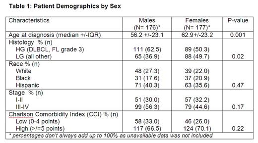 353 patients were included in the analysis. Median follow-up for all patients was 37.3 months (range 0.03-202.40). Baseline characteristics between male and females were similar with the exception of age at diagnosis and histology (see Table 1). On univariate analysis there was no OS difference between male and female patients (p=0.13), while race was associated with significant differences in OS (p=0.04; see Fig. 1). In the multivariate model, only stage >/=3 was associated with worse survival (Hazard Ratio [HR] 2.78, 95% CI 1.62-4.77; p<0.0001), but there was no significant association with OS for type of lymphoma (HGL vs. LGL) or the CCI (low vs. high score) and these 2 variables were therefore eliminated from the final multivariate model.