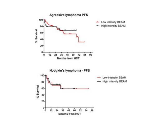 We conducted a retrospective sequential-cohort analysis of 143 chemosensitive lymphoma patients treated with BEAM regimen prior to HCT, from January 2005 to June 2013 at two transplant centers in Israel. Fifty-six (39%) patients were treated with hiBEAM (carmustine 300mg/m2, day -6, etoposide 400 mg/m2, days -5 to -2, cytarabine 400 mg/m2, days -5 to -2, and melphalan 140 mg/m2, day -1), and 87 (61%) with loBEAM (any drug dose lower than the above). Diffuse large B cell (DLBCL), mantle-cell (MCL), and T-cell lymphoma (TCL) were defined as aggressive lymphoma. We compared regimen related toxicities, event free and overall survival between the low and high intensity groups. Categorical variables were compared using the chi-square, and the Mann-Whitney non parametric test was used to compare between continuous variables, adjusted to age, when applicable. Overall and progression free survival were estimated using the method of Kaplan and Meier, with cells infusion day serving as day 0.