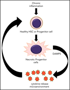 Phospho-MLKL (pMLKL) staining of bone marrow from a patient with refractory anemia with ringed sideroblasts. Bone marrow was stained with anti-pMLKL antibody (green), and bone marrow nuclei were stained with DAPI (4',6-diamidino-2-phenylindole; blue). See the article by Wagner et al on page 107.