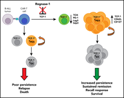 Durable chimeric antigen receptor (CAR) T cell-mediated leukemia eradication is associated with persistence of CAR T cells. Zheng and colleagues used immunocompetent murine models and human xenografts to demonstrate that deficiency of the ribonuclease regnase-1 enhances CAR T-cell persistence and immunity against acute lymphoblastic leukemia (ALL) by reducing degradation of the transcription factor TCF-1 and thereby augmenting formation of immunity-promoting “precursor exhausted” T cells.