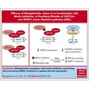 Bourgeois and colleagues report that in combination, the potent IKAROS protein degrader mezigdomide and menin inhibitors demonstrate synergistic activity against lysine methyltransferase 2A (KMT2A)–rearranged and nucleophosmin-mutant (NPM1c) acute myeloid leukemia (AML). Mezigdomide also has single-agent activity in AML cells and xenografts. These data support clinical trials of this novel combination in KMT2A-rearranged and NPM1c-mutant AML.