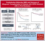 Othman et al used prospective data from the United Kingdom National Cancer Research Institute AML17 and AML19 studies to determine the implications of molecular measurable residual disease (MRD) status for improving survival with allogeneic transplantation in first complete remission (CR1-allo) of NPM1-mutated acute myeloid leukemia (AML). The authors demonstrate that CR1-allo improves overall survival in patients who are MRD+ but not in those who are MRD-, independent of FLT3 status. These results suggest that MRD determination should be standard of care for determining the need for CR1-allo in NPM1-mutant AML.